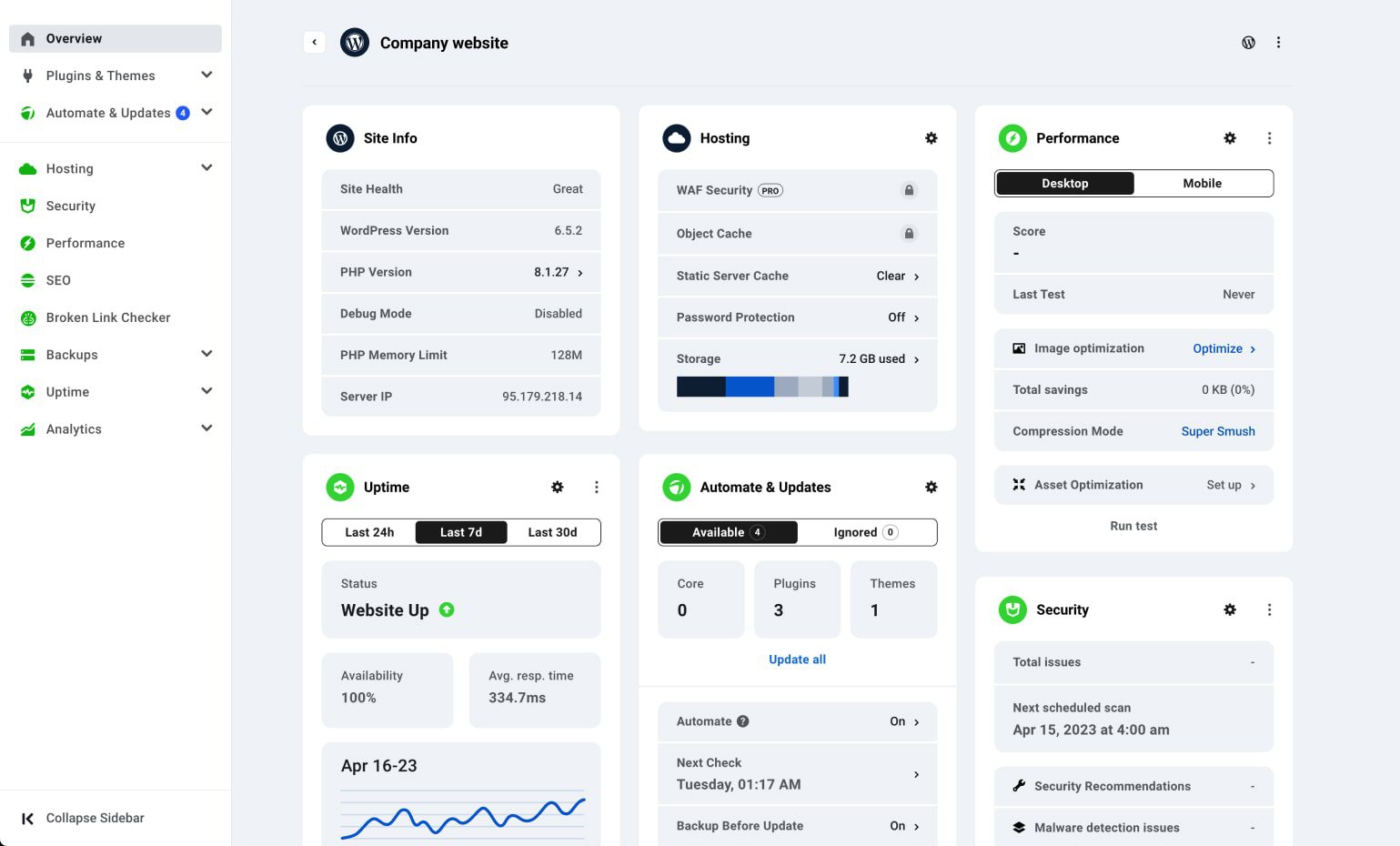 Наслаждайтесь автоматическими безопасными обновлениями, мониторингом uptime, сканированием безопасности и автоматическими отчетами.
